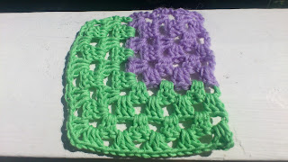 Fortsätt med varv 2+3 tills rutan är lagom stor. Kan göras 4 st med färgbrytning på samma ställe, fast kanske i olika färger, och kommer då att bilda en stor mormorsruta mitt i filten.